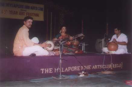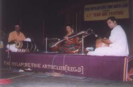 | As I entered the MFAC hall on the afternoon of 21st December 2000, it was already occupied with a small group of audience for the Vina concert of Geetha Bennett. The accompaniments were S Balashankar (Mridangam) and Adambakkam Shankar (Ghatam), both disciples of Kumbakonam Rajappa Iyer. The concert started with 'Sarasijanabha' the Ata Tala Varnam in raga Kambodhi, suitable for the beginning a concert with. |