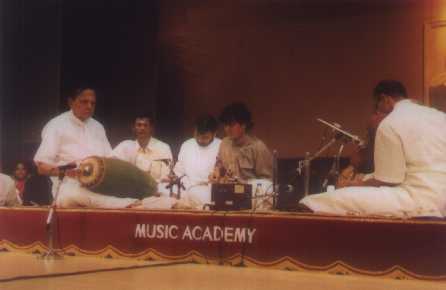 His handling of Keeravani in his concert at the Music Academy on 23rd December 2000 was superb. He displayed some of the tactics with particular reference to the handling of the instrument. For instance, he touched the anumandra panchama and the atitara shadja during his forays in the raga alapana of the same. The Pallavi which he had set up in Keeravani in Adi tala with a sama eduppu proved suitable beyond measure for being handled on his instrument, while at the same time providing ample scope for the rhythmic supporters. |