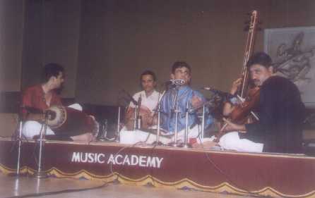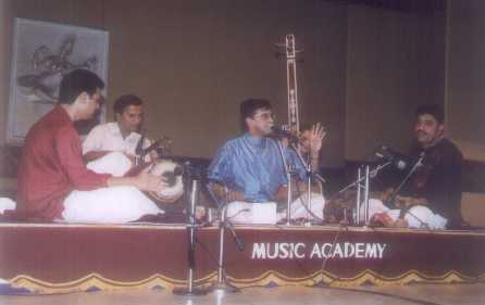 | The concert of Madurai R Sundar, a disciple of T N Seshagopalan, exhibited a high standard in his concert at the Music Academy on the 20th December 2000. His voice is all-powerful and expressive beyond the madhya sthayi panchama, with an easy reach in the higher octaves. Below madhya sthayi panchama though, there was not much vitality. Suggestive ideas were however not lacking. |