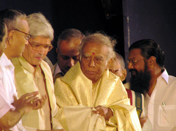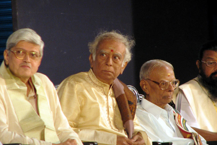 Srikantan and Vidwan Guru Karaikudi Mani listen to the felicitation speeches