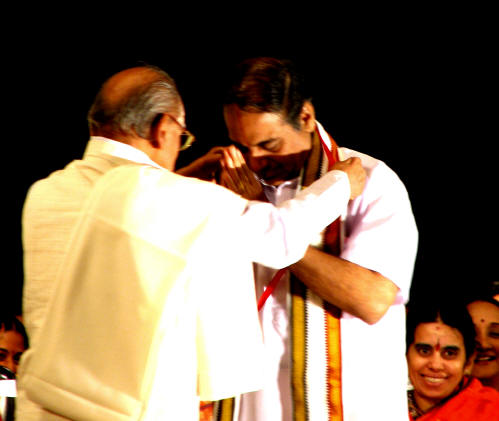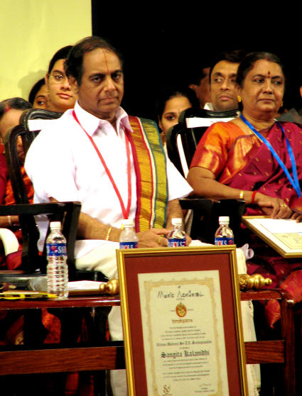 Seshagopalan with the 'birudu' and medallion - Music Academy 'Sadas', Jan. 1st